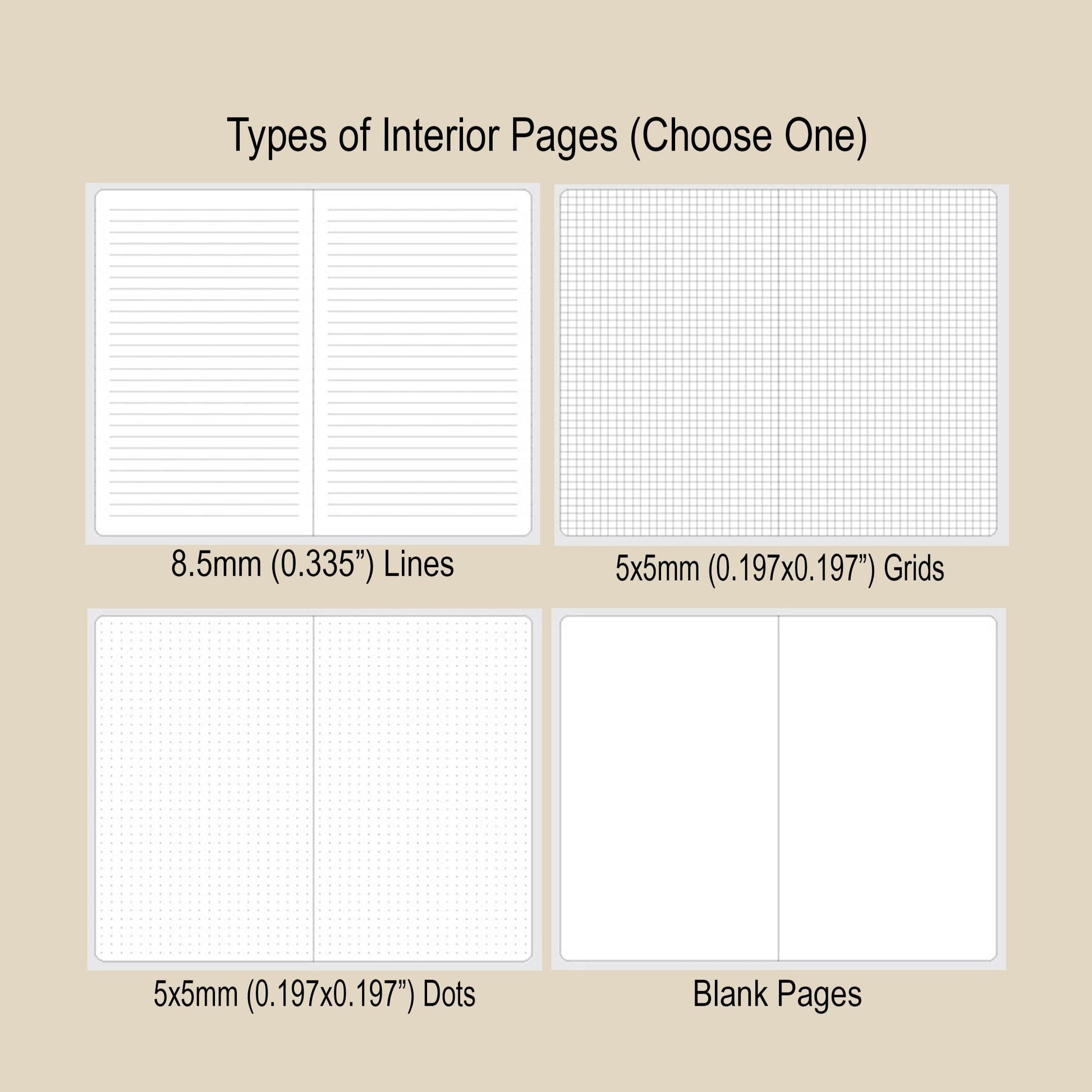 The notebook, opens flat for ease of writing and you can choose the interior pages to be lines, dots, grids or blank to suit your usage.